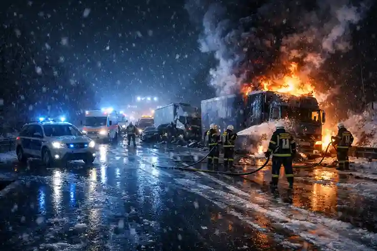 Besonders dramatisch verlief ein Zusammenstoß zwischen einem Kleintransporter und einem mit Papier beladenen Sattelzug. Durch die Wucht des Aufpralls fing der Lastwagen Feuer. Für den Fahrer des Transporters kam jede Hilfe zu spät – er konnte nicht mehr lebend aus dem Fahrzeug geborgen werden und starb noch an der Unfallstelle.