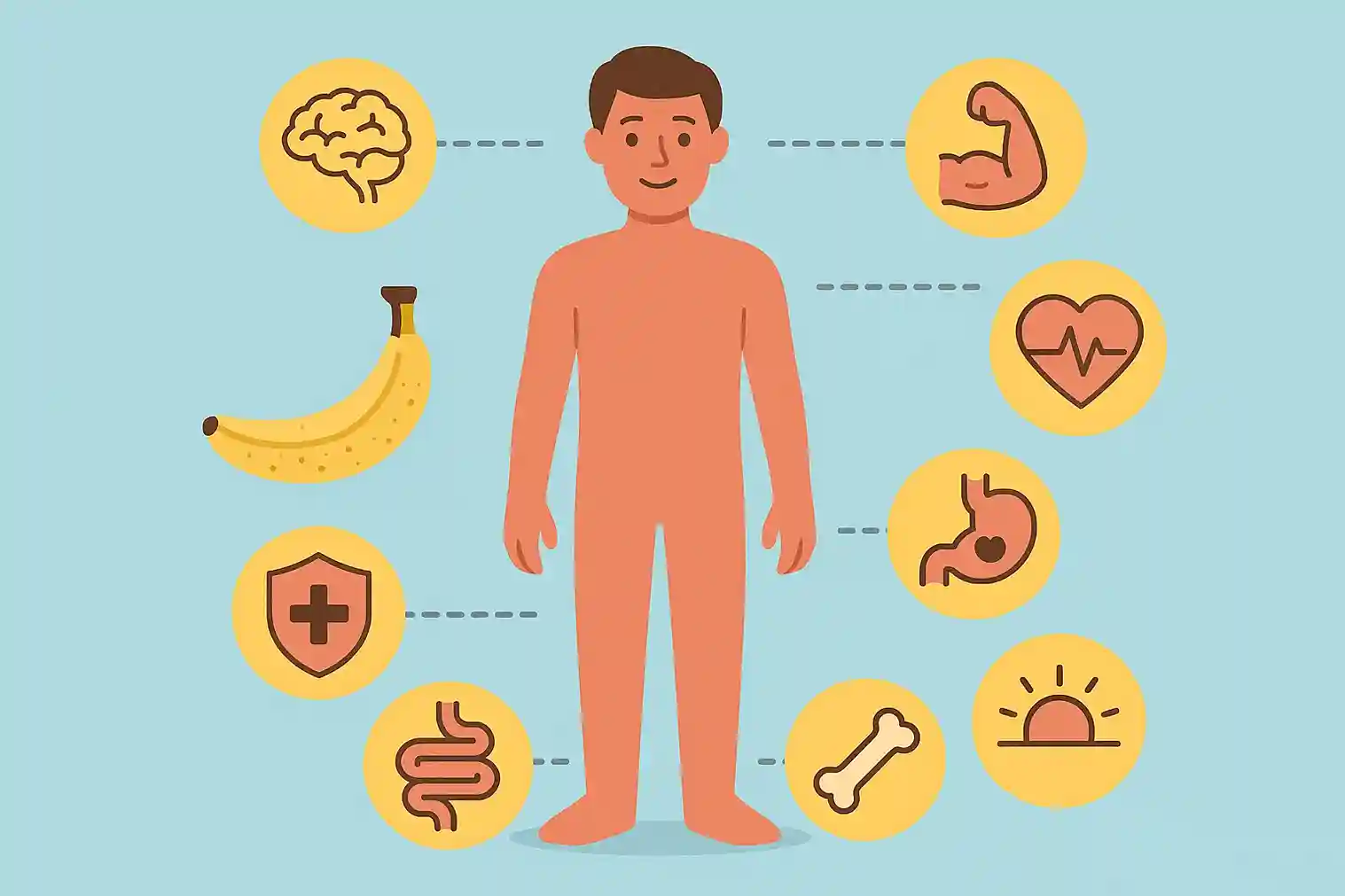 Bananen sind reich an präbiotischen Ballaststoffen, die das Wachstum nützlicher Darmbakterien fördern. Diese unterstützen eine gleichmäßige Verdauung, verhindern Verstopfung und tragen zur Stärkung der körpereigenen Abwehrkräfte bei. Gleichzeitig liefern die natürlichen Zucker der Banane kontinuierliche Energie ohne einen plötzlichen Anstieg des Blutzuckerspiegels, wodurch sie zu einer ausgewogenen, gesunden Frucht zählt.