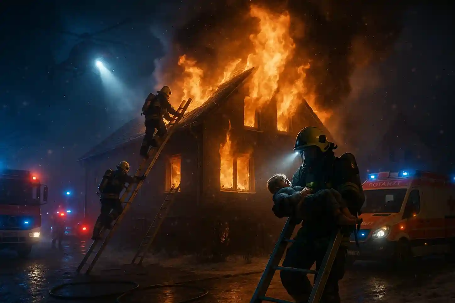 Ein Kind wurde im Obergeschoss vermisst. Die Treppe war bereits komplett unpassierbar. Unter schwersten Bedingungen kämpften sich mehrere Trupps über tragbare Leitern von außen in den ersten Stock vor. Vor dem Haus standen Notarzt und Rettungshubschrauber bereit. Die Feuerwehr konnte das Kind schließlich bergen und an den Rettungsdienst übergeben – doch alle Reanimationsversuche blieben erfolglos. Das Kind starb noch an der Einsatzstelle.
