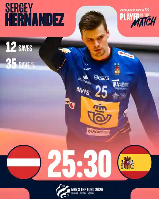 | AUT vs ESP | 25 : 30 | Spanien dominiert, Sergey Hernández Spieler des Spiels mit 13 Saves (35%). Österreich kämpft bis zum Ende, Tobias Wagner 6 Tore. |