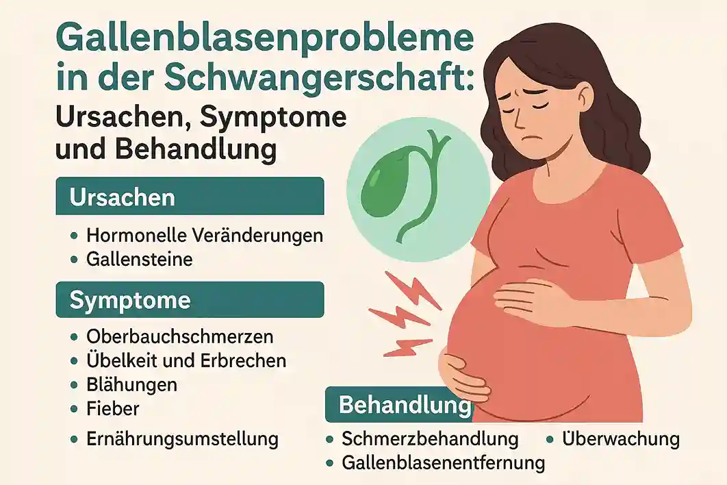 Im folgenden Artikel werden die häufigsten Gallenblasenprobleme in der Schwangerschaft beschrieben, darunter Gallensteine, Gallenblasenentzündung und die sogenannte Schwangerschafts-Cholestase. Außerdem erfahren Sie, welche Symptome auftreten, wie die Diagnose gestellt wird und welche Behandlungsmöglichkeiten bestehen.