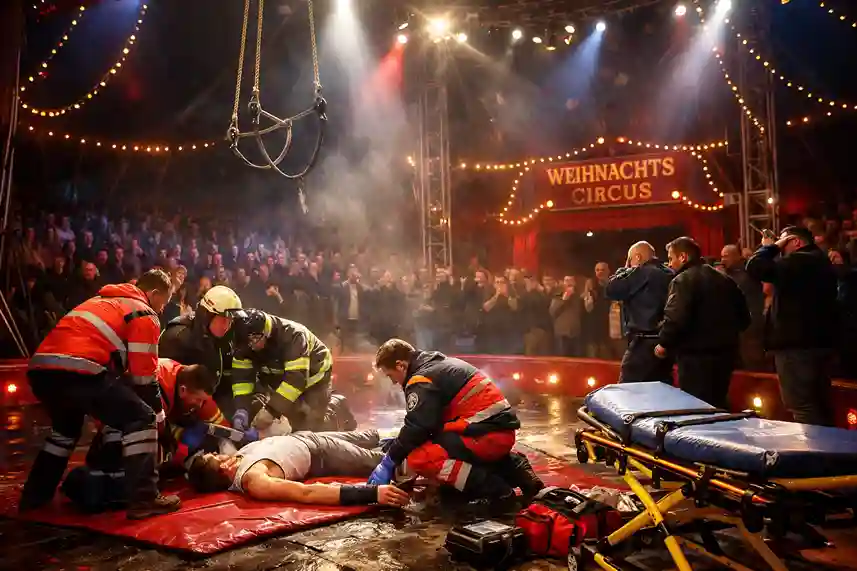Die Veranstaltung wurde vorsorglich unterbrochen, um Sicherheit und medizinische Versorgung zu gewährleisten. Das Artistenpaar wird derzeit weiter beobachtet.